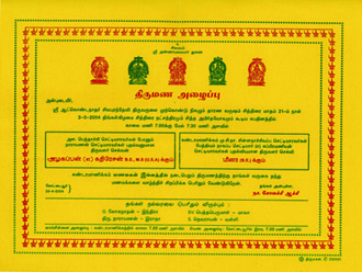 Traditional invitations are always printed on double-sided glossy art paper, yellow on one side, and pink on the reverse. The main text and images are always printed in dark green and red on the yellow side. Yellow and red in particular are considered to be auspicious colours in the Hindu tradition. Traditionally, the announcements are in the vernacular (in Tamil) and carry very little English text. However, nowadays it is increasingly common practice to have the English version of the invitation printed on the reverse (pink) side of the paper.
