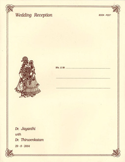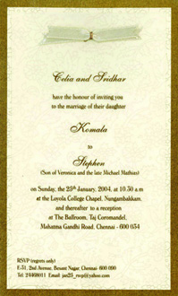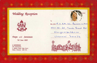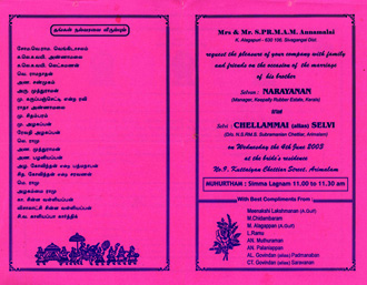 The traditional South Indian wedding invitation is not a card but a printed leaflet that borrows its form from the earlier tradition of oral announcement and from the form of a hand written letter.